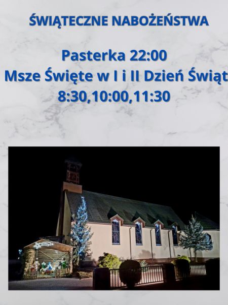 3. Uroczysta Pasterka w intencji Parafian i Sympatyków naszej parafii sprawowana będzie o godz. 22:00. Msze Święte w pierwszy i drugi dzień Świąt w porządku niedzielnym o godz. 8:30, 10:00, 11:30. Zaplanujmy tak świąteczne dni, by znaleźć chwilę na odwiedzenie naszej parafialnej świątyni i na indywidualną modlitwę i adorację przy żłóbku, na rodzinne śpiewanie kolęd.