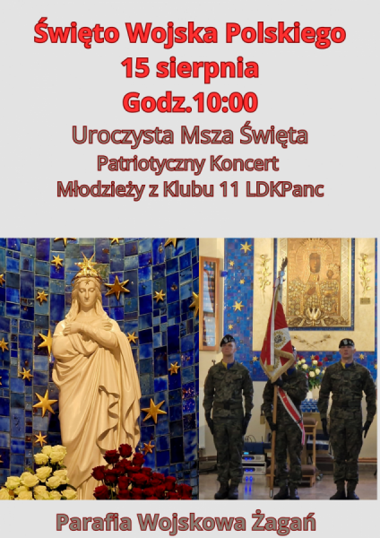 - Uroczysta Msza Święta w intencji naszej umiłowanej Ojczyzny i Żołnierzy Wojska Polskiego w naszej Wojskowej Świątyni będzie sprawowana w piątek 15 sierpnia o godz.10:00. Po Mszy Świętej patriotyczny koncert Młodzieży z Klubu 11 Lubuskiej Dywizji Kawalerii Pancernej. Serdecznie zapraszam Czcigodnych Parafian , Sympatyków, Mieszkańców Żagania.